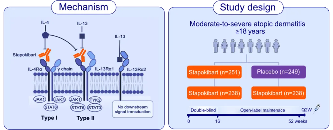 該研究是由北京大學人民醫院皮膚科張建中教授牽頭開展的一項多中心、隨機、雙盲、安慰劑對照的III期臨床研究,旨在評價司普奇拜單抗治療中重度特應性皮炎受試者的有效性和安全性。研究共納入500例中國中重度特應性皮炎受試者,是迄今先進療法中納入最大規模中國AD受試者的III期臨床研究。該III期臨床研究中,500例受試者按1:1隨機分配至300mg司普奇拜單抗組(首劑:600mg)或安慰劑組,每兩周給藥一次,治療16周(雙盲治療期)。隨后所有受試者均接受300mg司普奇拜單抗治療(安慰劑轉司普奇拜單抗首劑:600mg),每兩周給藥一次,治療36周(維持治療期)。