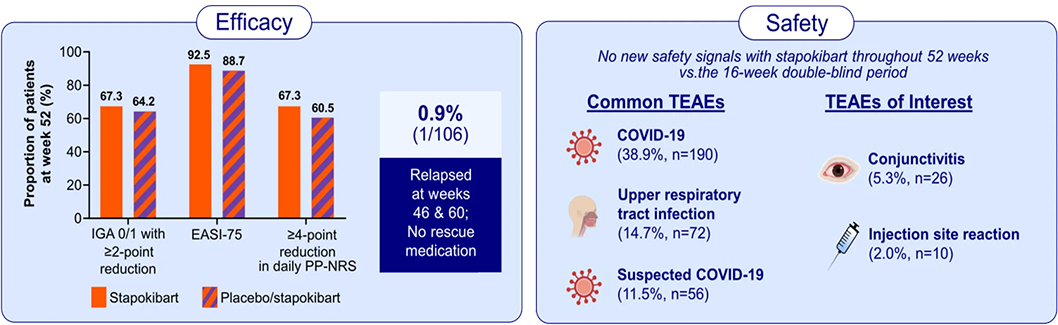 此前發表的雙盲期的結果顯示,司普奇拜單抗治療16周,對比安慰劑可顯著改善皮損,緩解瘙癢,并提高患者的生活質量,雙主要終點以及所有次要療效終點均達到,治療16周EASI-75應答率達66.9%,IGA應答率達44.2%。此次發表52周數據進一步顯示,司普奇拜單抗長期治療可產生持續的療效獲益,并具有良好的安全性。