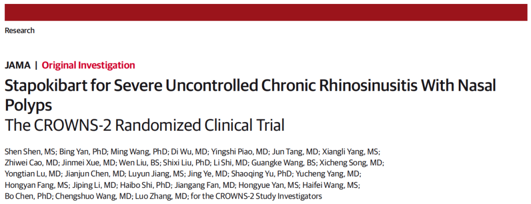 2025年8月18日,首都醫(yī)科大學(xué)附屬北京同仁醫(yī)院張羅教授與王成碩教授作為共同通訊作者,在國際頂級期刊《美國醫(yī)學(xué)會(huì)雜志》(JAMA,影響因子 55.0)發(fā)表突破性研究成果 —— 康悅達(dá)®(司普奇拜單抗)治療嚴(yán)重未控制的慢性鼻竇炎伴鼻息肉(CRSwNP)Ⅲ期臨床研究(CROWNS-2)結(jié)果。這是中國鼻科領(lǐng)域創(chuàng)新藥研究首次登頂JAMA,表明由國內(nèi)自主研發(fā)、我國科學(xué)家牽頭開展的生物制劑治療難治性慢性鼻竇炎伴鼻息肉研究獲國際學(xué)術(shù)界高度認(rèn)可,為該疾病治療提供了全新的 “中國方案”!