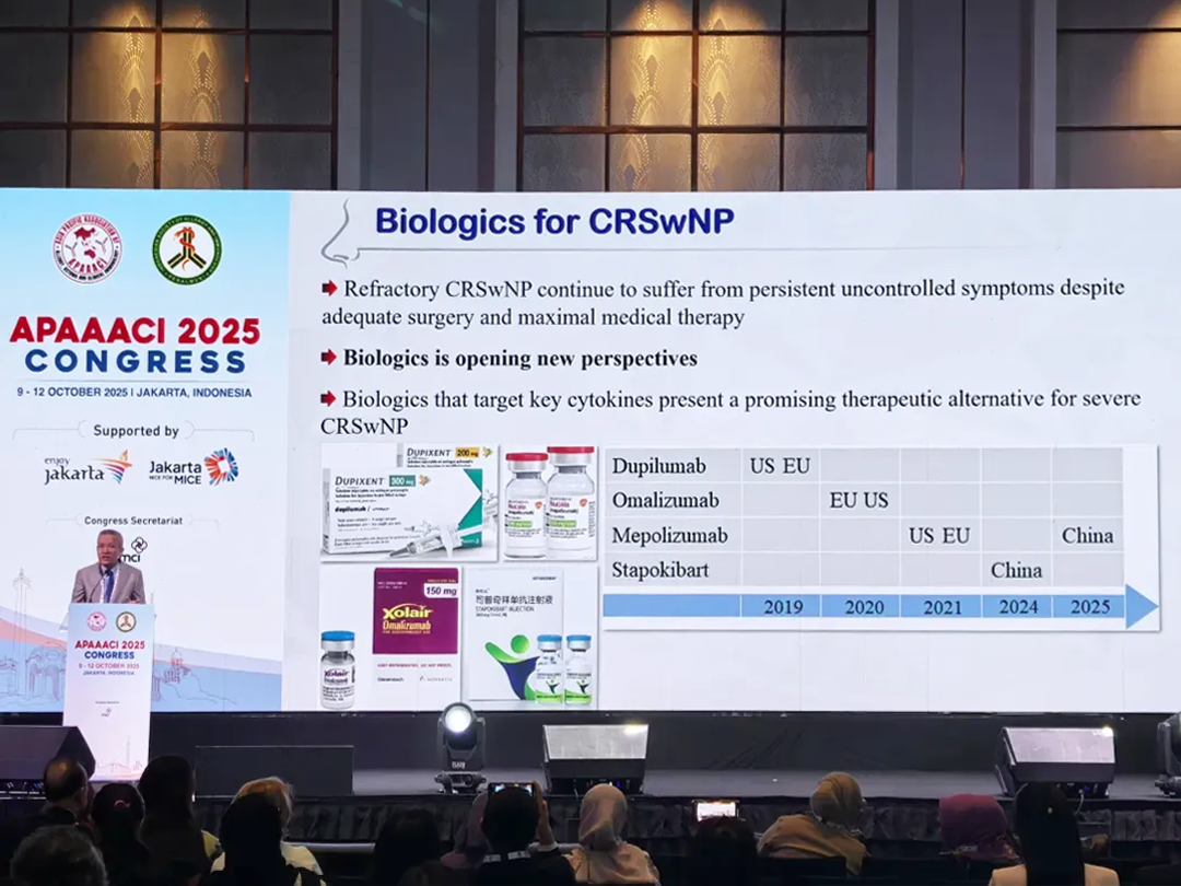 2025年10月9日至12日,由亞太過敏、哮喘與臨床免疫學會(APAAACI)與印度尼西亞過敏與免疫學會(ISAI)聯合舉辦的2025年APAAACI年會于印度尼西亞雅加達隆重召開,本次大會以“多元中的統一:推動過敏、哮喘與免疫學領域的科學與創新——從遺傳學到細胞治療”為主題,旨在融合最前沿的科學進展與臨床實踐經驗,面向臨床醫生與科研人員,推動學術與實踐的深度交流。上千位來自不同國家和地區的專家學者齊聚一堂,共同促進知識分享與跨領域合作,探討應對過敏與免疫性疾病挑戰和行業發展。司普奇拜單抗慢性鼻竇炎伴鼻息肉III期臨床研究數據亮相本次大會,在國際舞臺上展示中國的創新方案,獲得與會專家的廣泛關注。