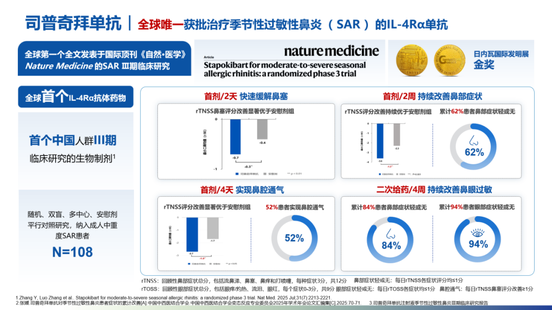 司普奇拜單抗治療SAR III期研究結果發表于《自然·醫學》(Nature Medicine),系全球首次報告IL-4Rα靶點藥物治療季節性過敏性鼻炎成果,也是中國科學家在過敏性鼻炎領域取得的引領世界的創新性成果。III期數據表明: